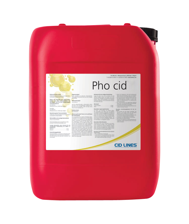 Pho cid is een zuur reinigingsmiddel voor het ontkalken en ontijzeren van leidingen en (koel)tanks. Pho cid wordt vaak afwisselend met DM Cid gebruikt. Melkreinigingszuur Pho cid is samengesteld op basis van Fosfor- en Zwavelzuur. Het product is een circulatiereiniger, te gebruiken bij DeLaval VMS en GEA robots en bij melkkoeltanken & melkmachines.