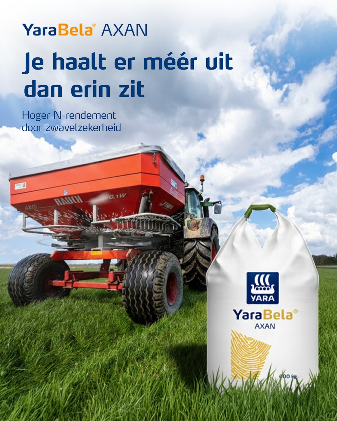 • Met de nieuwe meststof YaraBela Axan combineert u 27 procent stikstof (N) met 9,3 procent wateroplosbare zwavel (SO₃). Zo krijgt het grasland het hele groeiseizoen voldoende zwavel, wat de stikstofopname en eiwitkwaliteit verbetert. Door zwavel bij elke gift toe te passen voorkomt u tekorten en ondersteunt u een uniforme groei en hogere opbrengst.