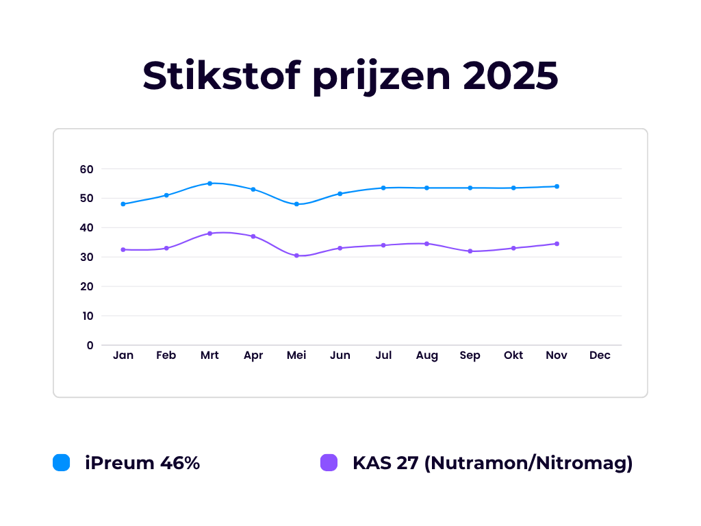27-11-2025: Stikstof prijzen zijn sinds augustus 2025 licht stijgende, met name de KAS producten (Nutramon, Nitromag, Sulfan, Dynamon) hebben een stijgende lijn vertoond. Producten op basis van Ureum zijn naar verhouding minder gestegen.